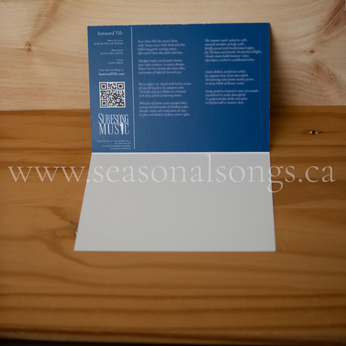 Featuring gorgeous illustrations by Toronto based visual artist Alana McCarthy, one of the two inside panels of these 7”x5” greeting cards contains the lyrics to “Sunward Tilt”, one of the four movements from Suresh Singaratnam’s song cycle for a cappella choir: “Seasonal Songs for Southern Ontario”.